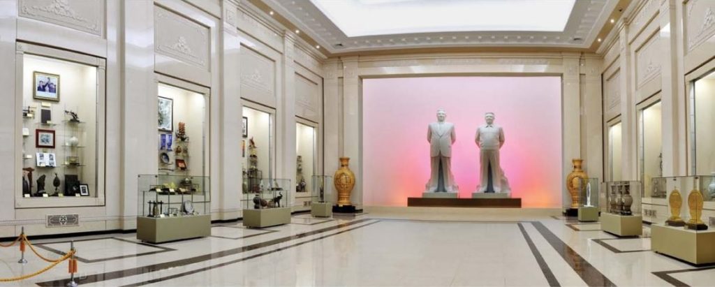 Your visit will begin in the General Introduction Hall which features white marble statues of President Kim Il Sung and Chairman Kim Jong Il bathed in red light.